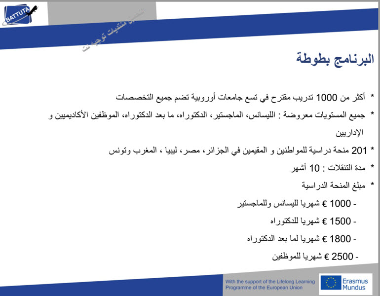 وتجدر الإشارة إلى أنه في إطار من ايراسموس موندوس الذي يموله برنامج المفوضية الأوروبية بطوطة هو مخصص لتطوير العلاقات بين أوروبا وشمال أفريقيا من خلال التنقل بين المنطقتين. جوائز التميز بما في ذلك جميع شهريا، ورسوم النقل ورسوم التسجيل يجوز منح للطلاب للشهادة في Postdoctorat، شخصية أو المعلمين الإداري لإثراء رحلتهم، وتبادل معارفهم وخبراتهم .