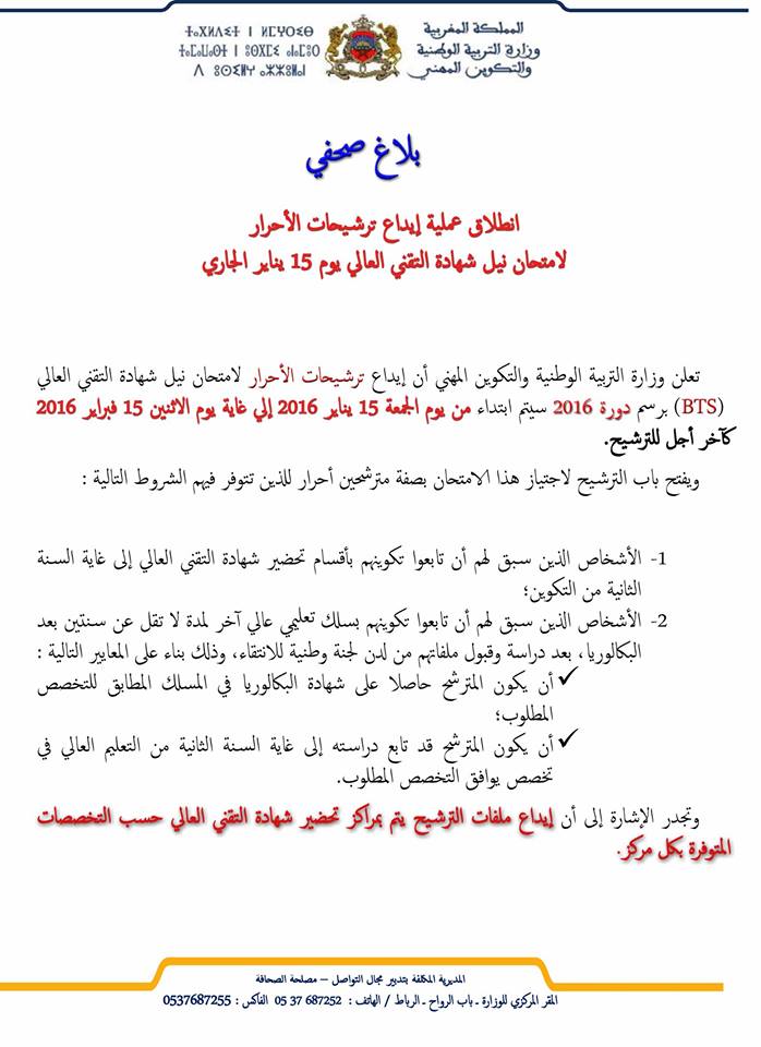 تعلن وزارة التربية الوطنية والتكوين المهني أن إيداع ترشيحات الأحرار لامتحان نيل شهادة التقني العالي (BTS) برسم دورة 2016 سيتم ابتداء من يوم الجمعة 15 يناير 2016 إلي غاية يوم الاثنين 15 فبراير 2016 كآخر أجل للترشيح.
