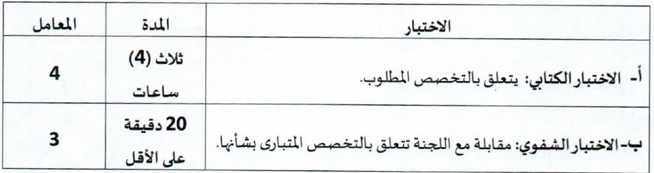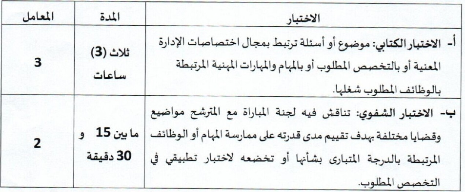 تشتمل المباراة المذكورة على اختبار كتابي واختبار شفوي تحدد فيها المدة والمعامل كما يلي: