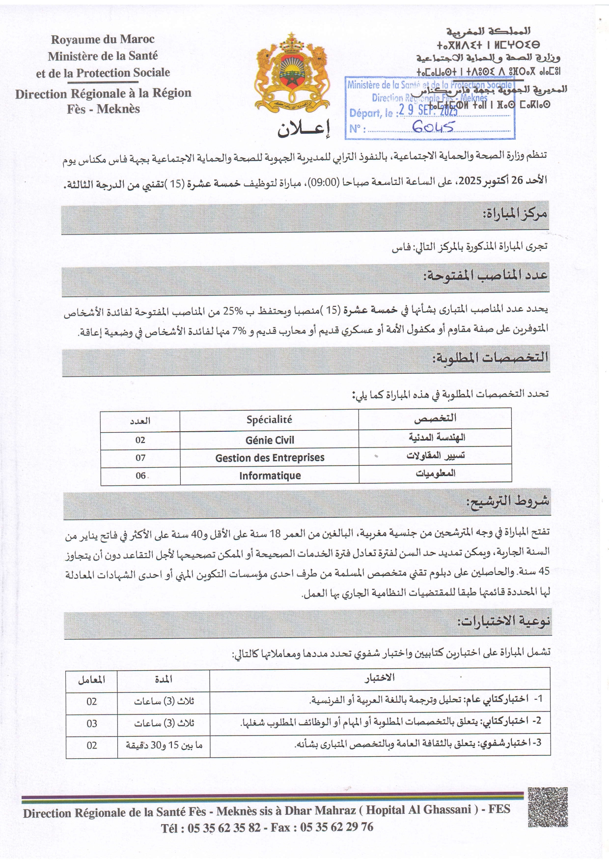 تنظم وزارة الصحة والحماية الاجتماعية، بالنفوذ الترابي للمديرية الجهوية للصحة والحماية الاجتماعية بجهة فاس مكناس، مباراة لتوظيف خمسة عشرة (15) تقنيًا من الدرجة الثالثة.