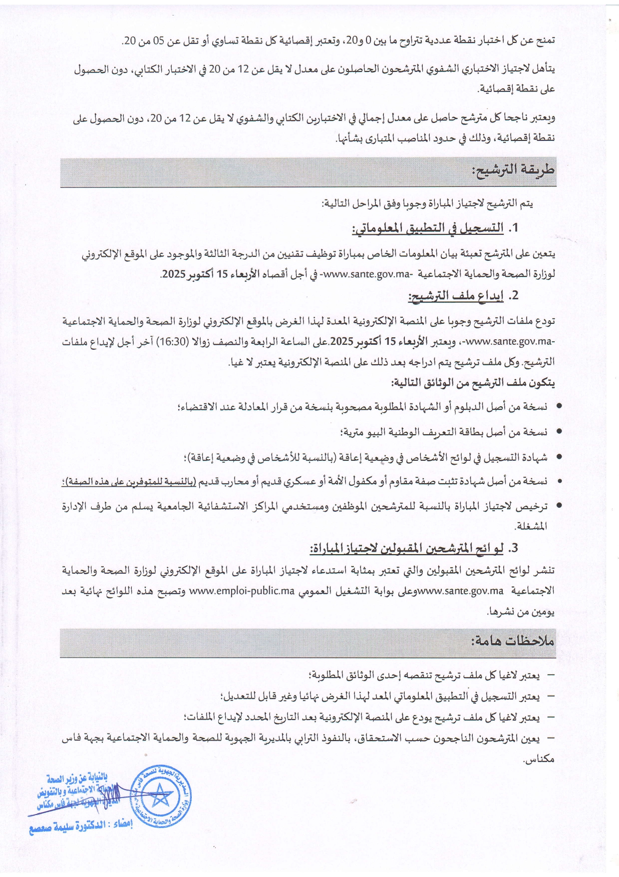 يتعين على المترشح تعبئة بيان المعلومات الخاص بالمباراة والموجود على الموقع الإلكتروني لوزارة الصحة والحماية الاجتماعية –
