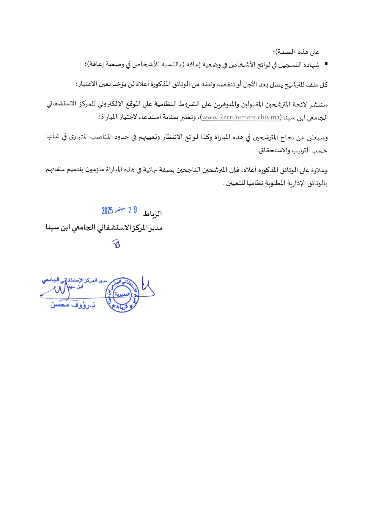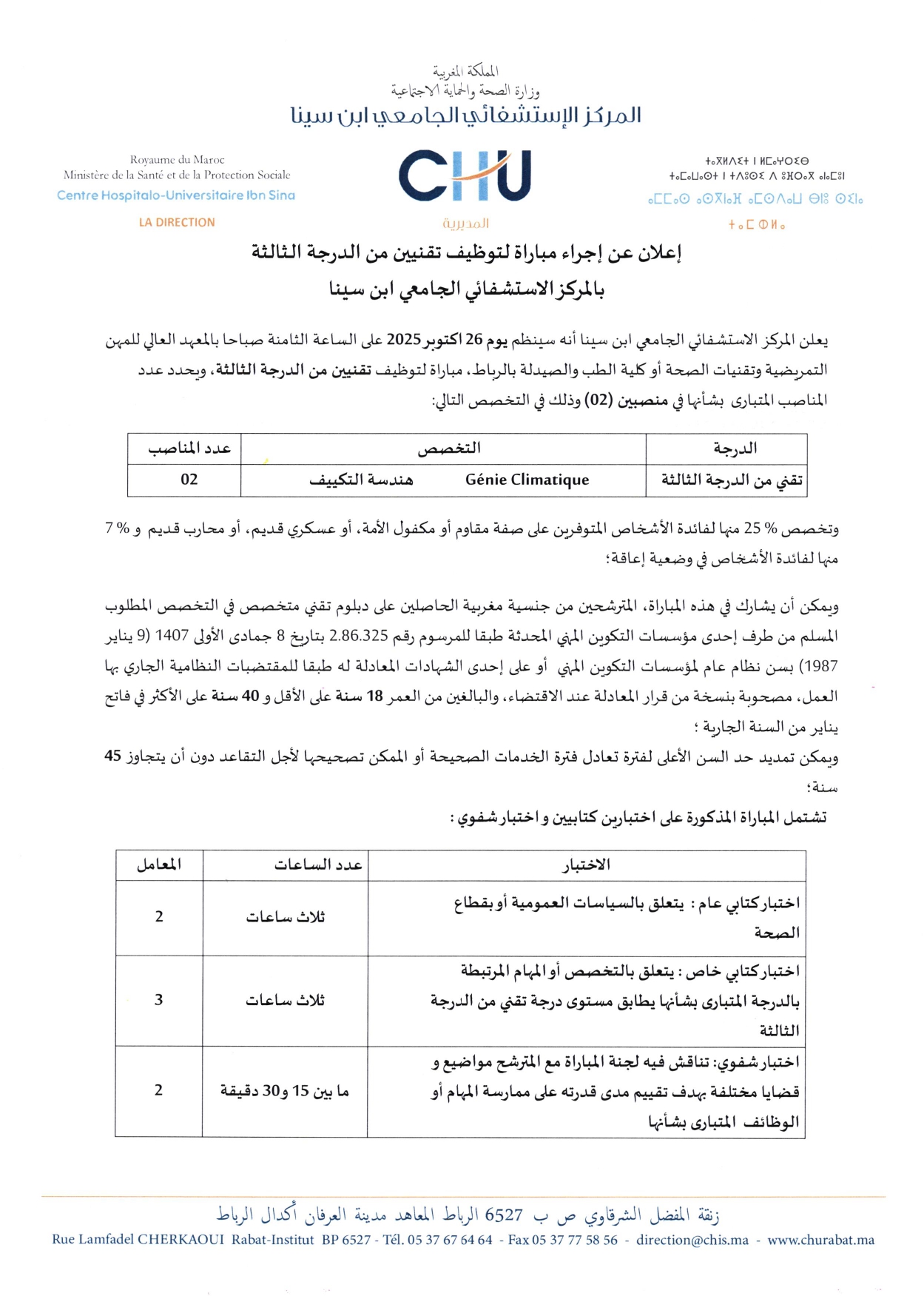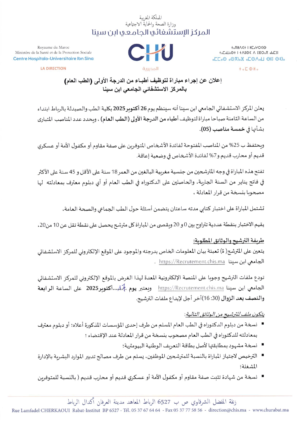 ينظم المركز الاستشفائي الجامعي ابن سينا (CHUIS) مباريات لتوظيف 14 منصبًا موزعة كما يلي: