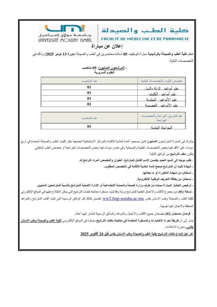 l’Université Sidi Mohamed Ben Abdellah organise un concours pour le recrutement de 5 Maîtres de Conférences.