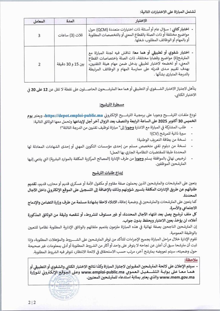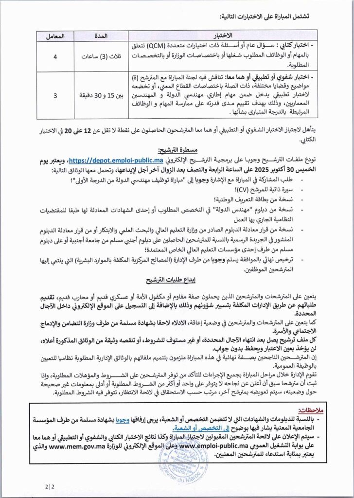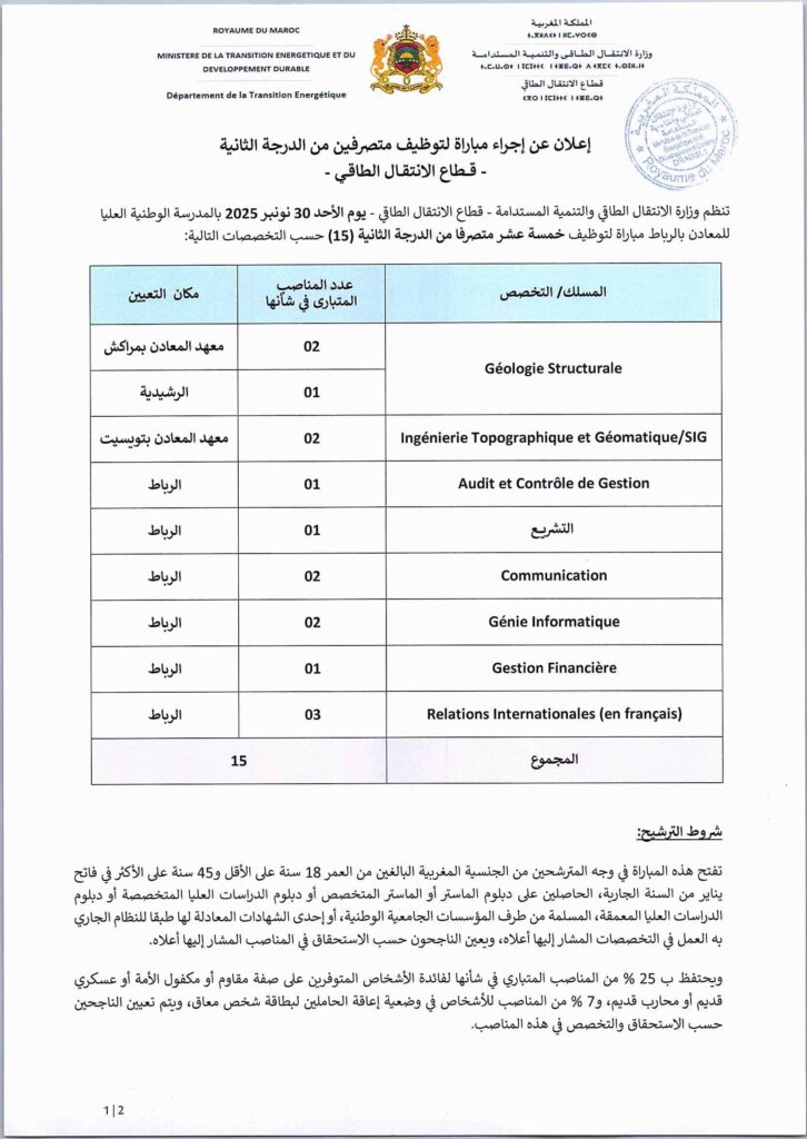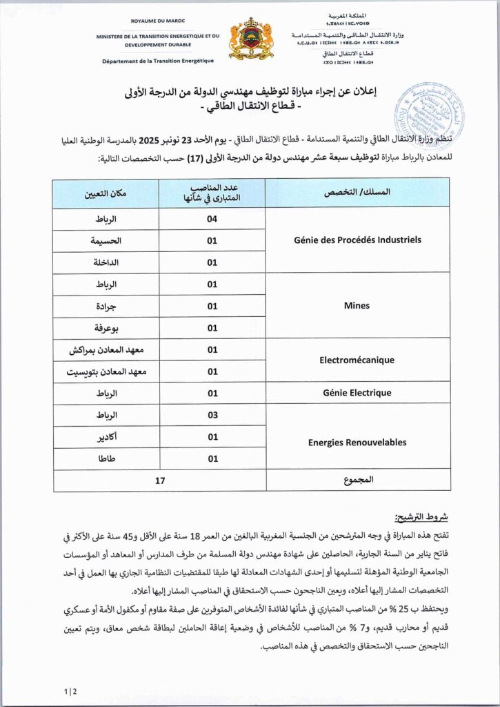 Le Ministère de la Transition Energétique et du, Département de la Transition Energétique, organise un concours pour le recrutement (40) postes au titre de l’année 2025.