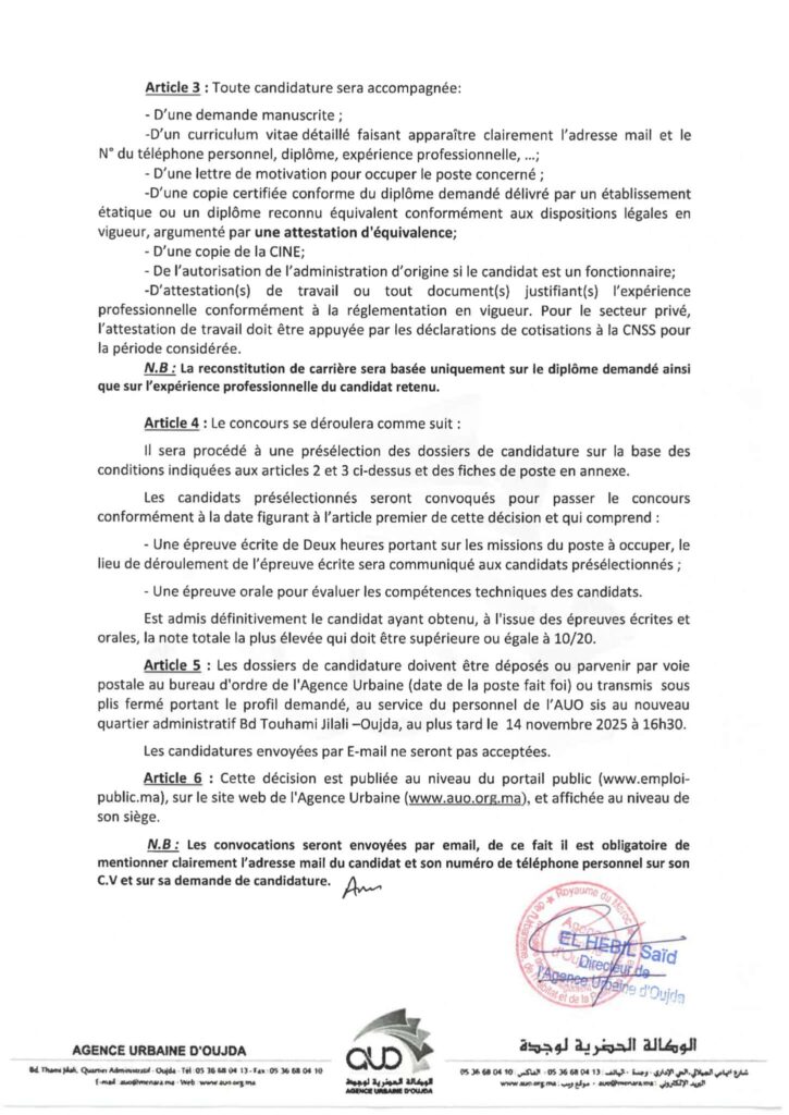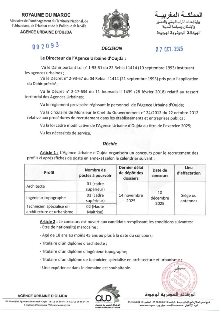 organise un concours pour le recrutement de 4 postes répartis comme suit: