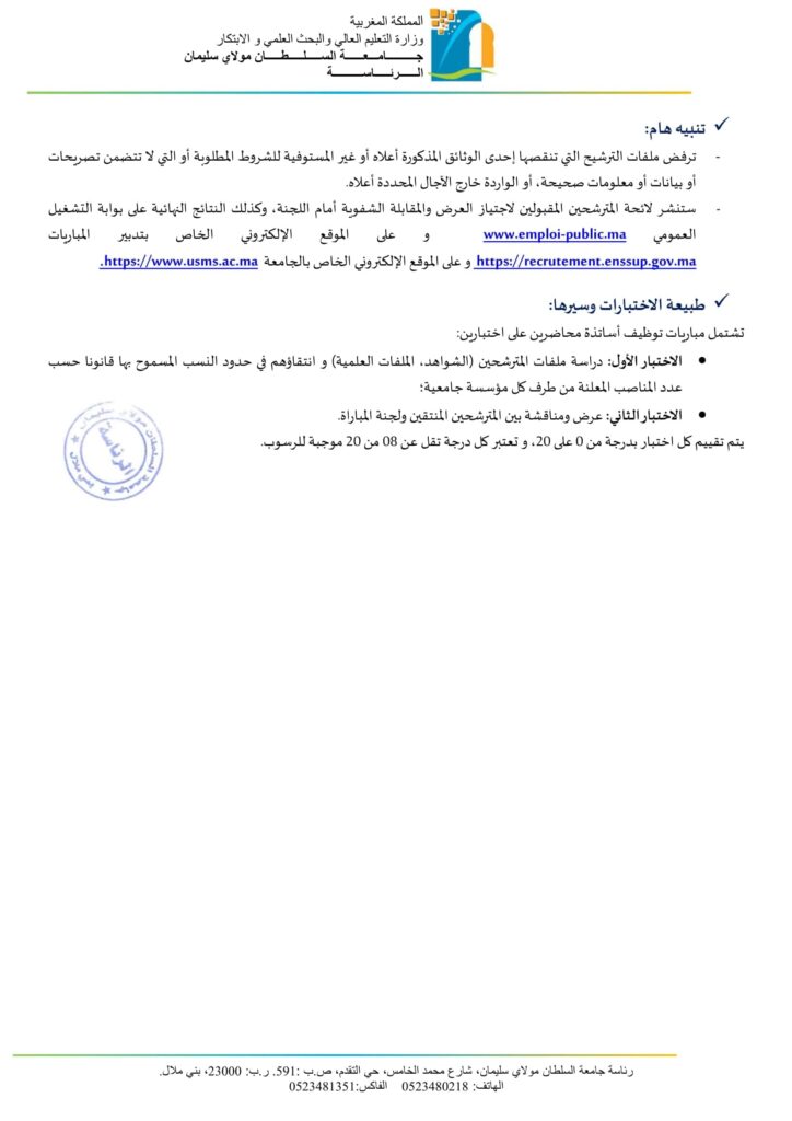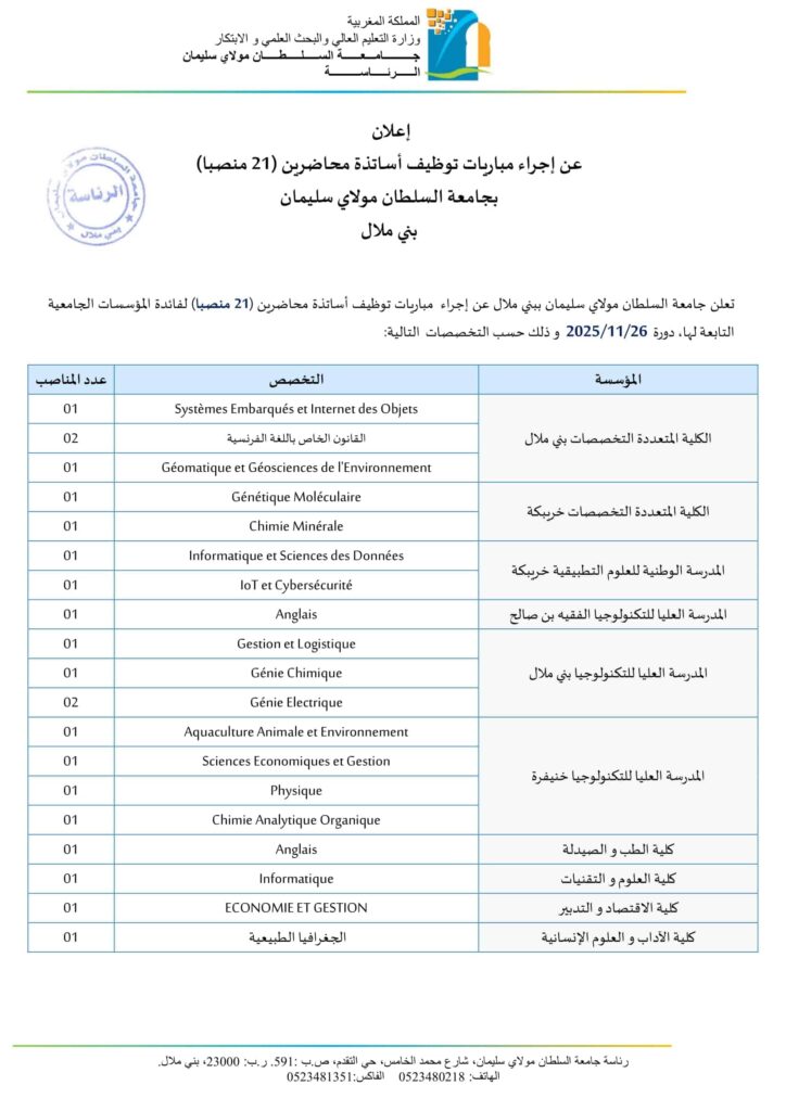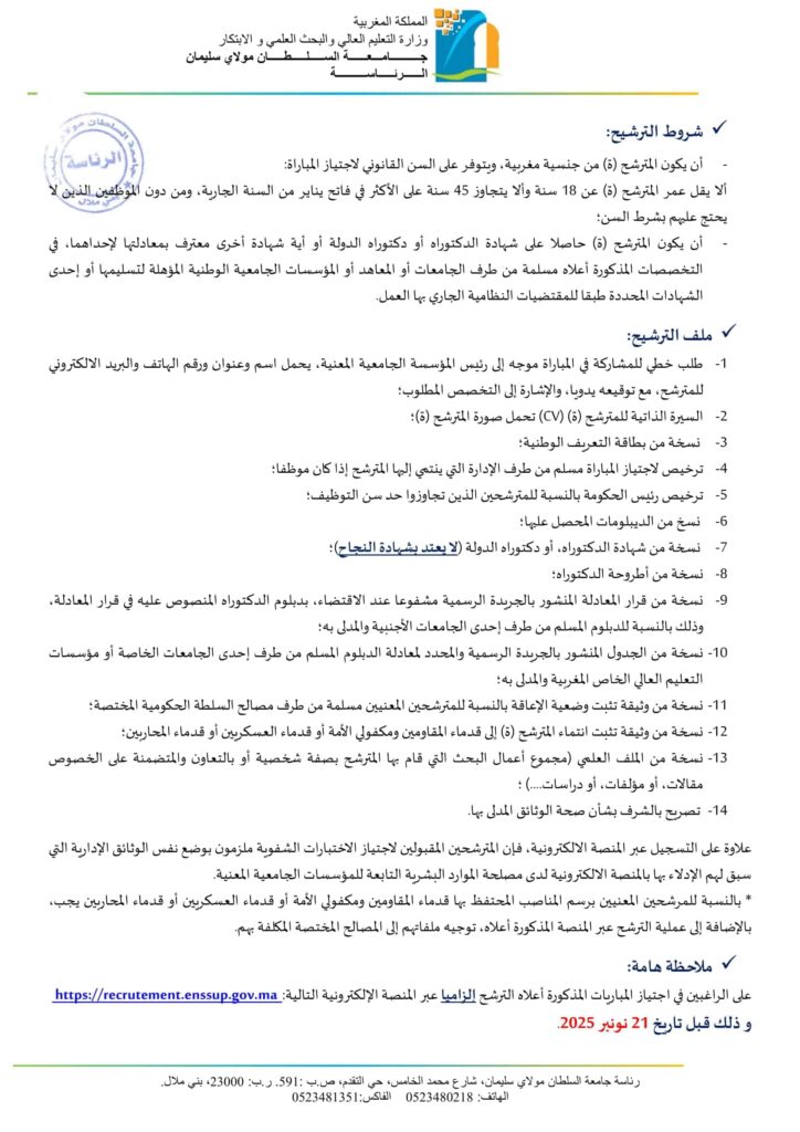 L’Université Sultan Moulay Slimane organise un concours pour le recrutement de 21 Maîtres de Conférences.