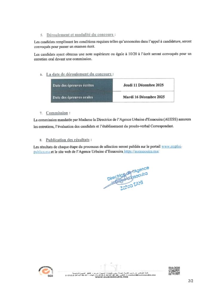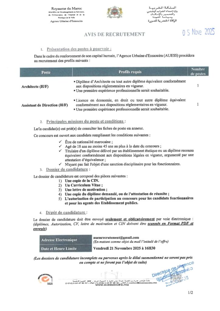 L’Agence Urbaine d’Essaouira organise un concours pour le recrutement de 2 postes répartis comme suit:
