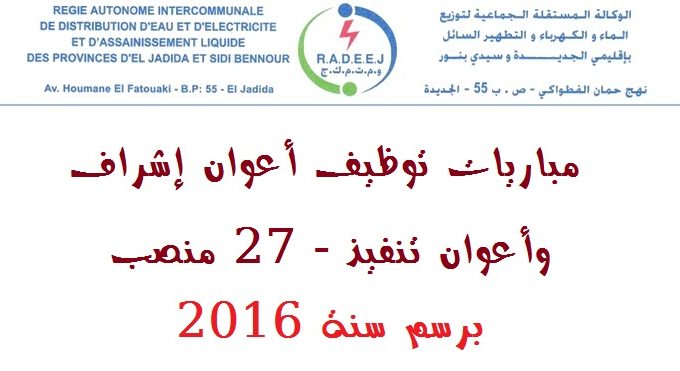 الوكالة المستقلة الجماعية لتوزيع الماء والكهرباء بالجديدة: المدعويين لمباراة لتوظيف 24 عون إشراف يوم 02 أكتوبر 2016