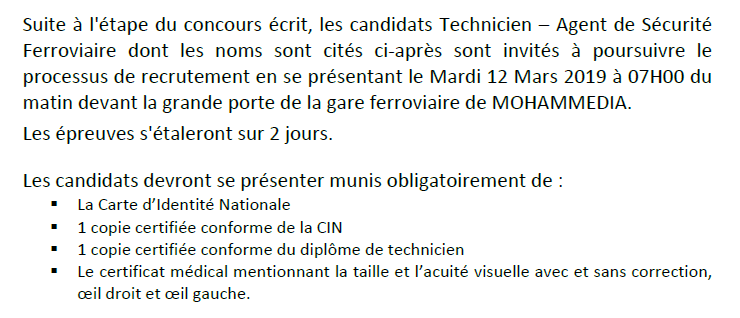 المكتب الوطني للسكك الحديدية: لائحة الناجحين في مباراة توظيف تقنيين – متعامل أمن قطارات