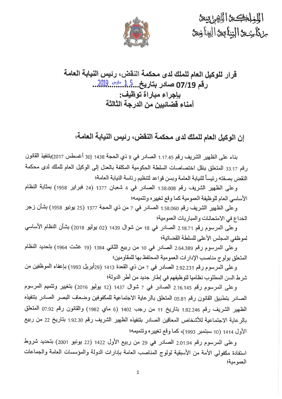 عــــــــاجل… رئاسة النيابة العامة: مباراة لتوظيف 82 أمناء قضائيين من الدرجة الثالثة. آخر أجل 01 ابريل 2019