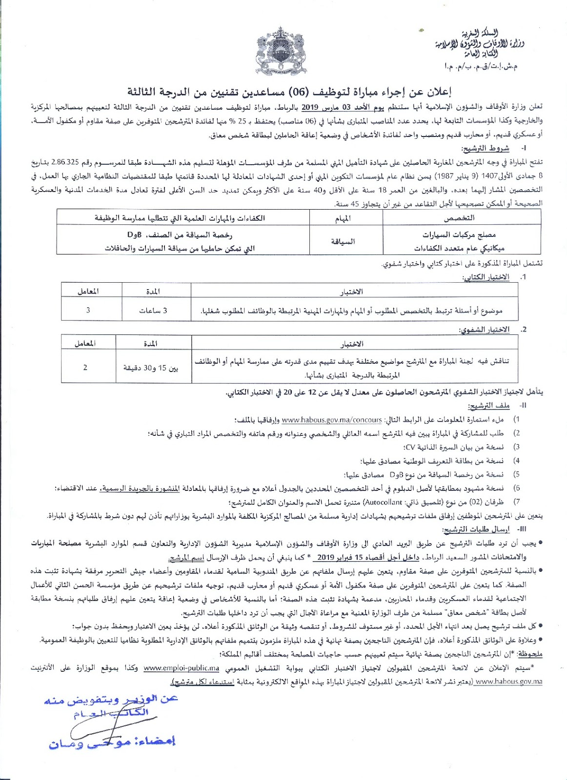 وزارة الأوقاف والشؤون الإسلامية: مباراة لتوظيف 06 مساعدين تقنيين من الدرجة الثالثة. آخر أجل 15 فبراير 2019